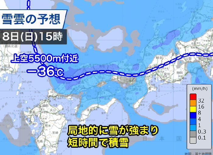 非常に強い寒気が南下する影響で、8日(日)は大阪市や神戸市・宝塚など関西エリアや四国、山陽なども積雪の恐れがでてきました。 普段は雪が少ない所で積もるため、交通への影響が大きくなる見通しです。 5CM以上積もると、大混乱が怒るかもしれません。