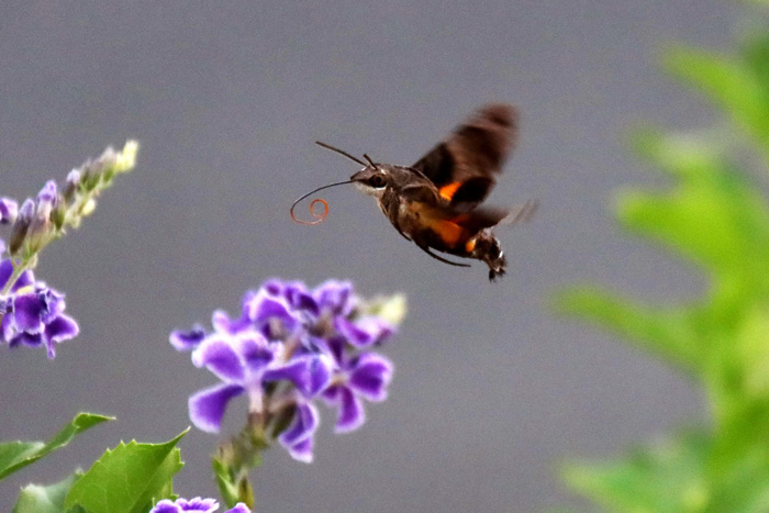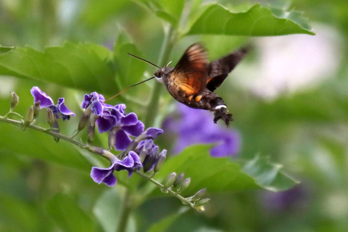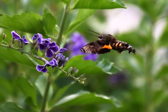 今日は近所で撮ったホシホウジャクのお届けです。 名前を検索して判りました。 動きが早いので撮るのは中々難しいで蛾ですね。 ジュランタ・タカラヅカの花にいました。 |